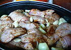 Dziś, bo rankiem nie było w sklepie kurczaków, zrobiłam to danko z dwoma plastrami karkówki- jest pyszne!Karkówka była b. chuda więc dodałam w trakcie duszenia dwie chochelki swojskiego bulionu.Poza tym po odkryciu podpiekałam nieco dłużej.Po wierzchu posypałam posiekną natką. Rozpływa się w ustach!