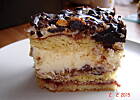 HIT imprezy :) Wujek, który przyjechał zza granicy na dzień dobry zjadł 3 kawałki. Wujek nie zachwyca się byle czym i jakby nie było dobre to by mi wprost powiedział. Pozostali jak i ja tez uważamy, że ciasto jest świetne. Troszkę jednak zmieniłam składanie tzn. połamał mi się jeden placek więc, żeby się całkiem ciasto nie rozpadło posmarowałam cienki biszkopt ok. 1 cm ( został mi z innego ciasta ) powidłami, na to dałam placek z bakaliami potem krem, na to znów placek z bakaliami i przyozdobiłam polewą czekoladową z przepisu Alll.Placki układałam bakaliami do góry.