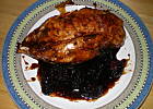 Cos mi sie wydaje, ze nawet nie powinnam pisac tego komentarza, ale jednak moje danie bylo zainspirowane Twoim przepisem, wiec zaryzykuje ;)) A wiec ja stworzylam moje dzielo z piersi kurczaka, kazda polowke piersi nacielam wzdluz tworzac kieszen, ktora napakowalam serkiem kozim z suszonymi zurawinami i spielam wykalaczkami. Po czym lekko zbrazowilam na patelni z olejem kokosowym, wyjelam mieso i w patelni zredukowalam ocet balsamiczny, potem dodalam swieze jezyny i wlozylam mieso spowrotem. Calosc pokropilam lekko miodem i sokiem z cytryny i zapieklam w piekarniku przez 20 min. Pychota, bardzo mi sie podobal ten pomysl faszerowania miesa mieszanka sera i zurawin, a nie mialam akurat schabu, wiec musialam zrobic z tego co bylo w domu :))) Z czystego lenistwa nie chcialo mi sie pojsc po schab..... mam nadzieje, ze sie nie obrazisz o profanacje Twojego przepisu, ale tez obiecuje powtorke ze schabu. A tak wygladalo moje dzielo: